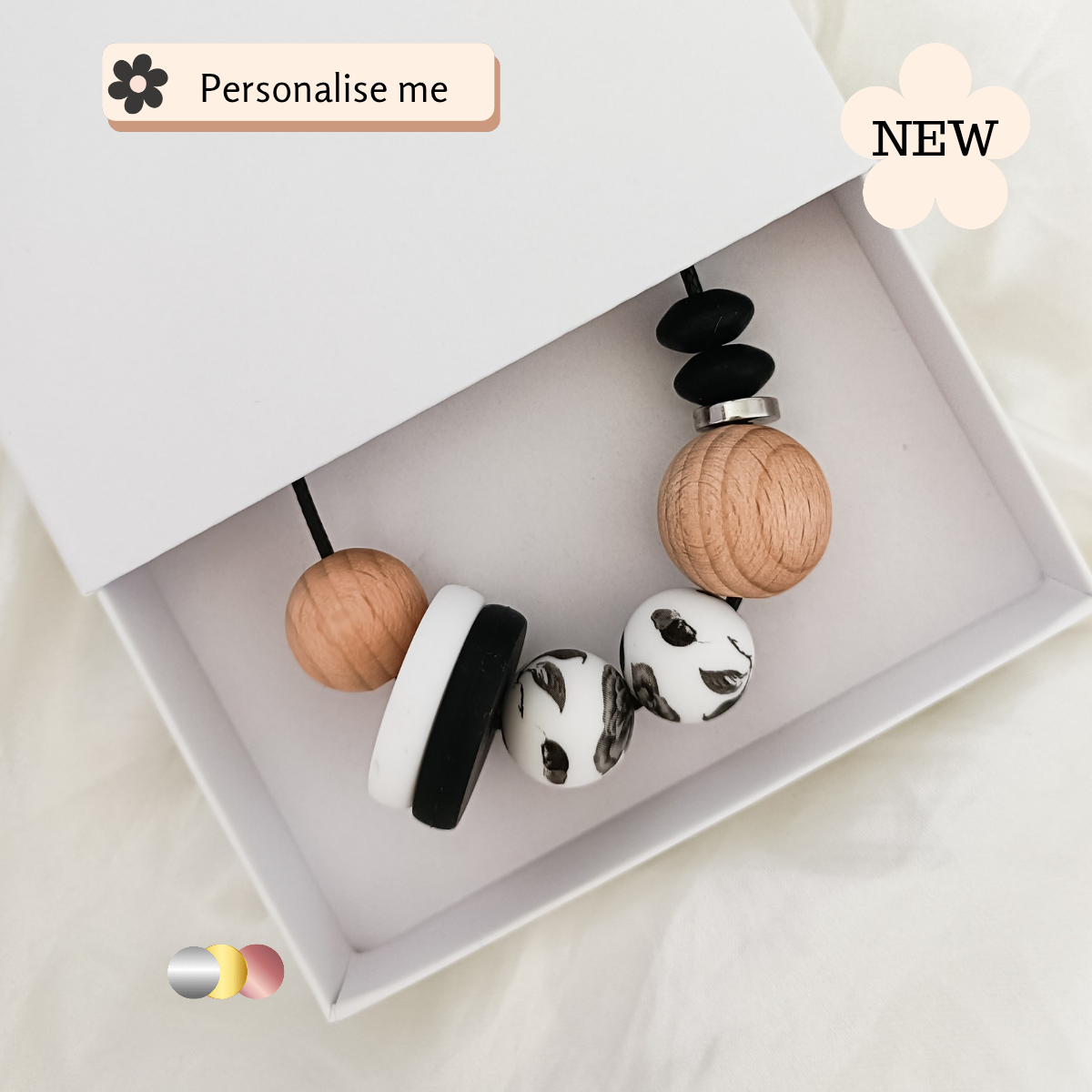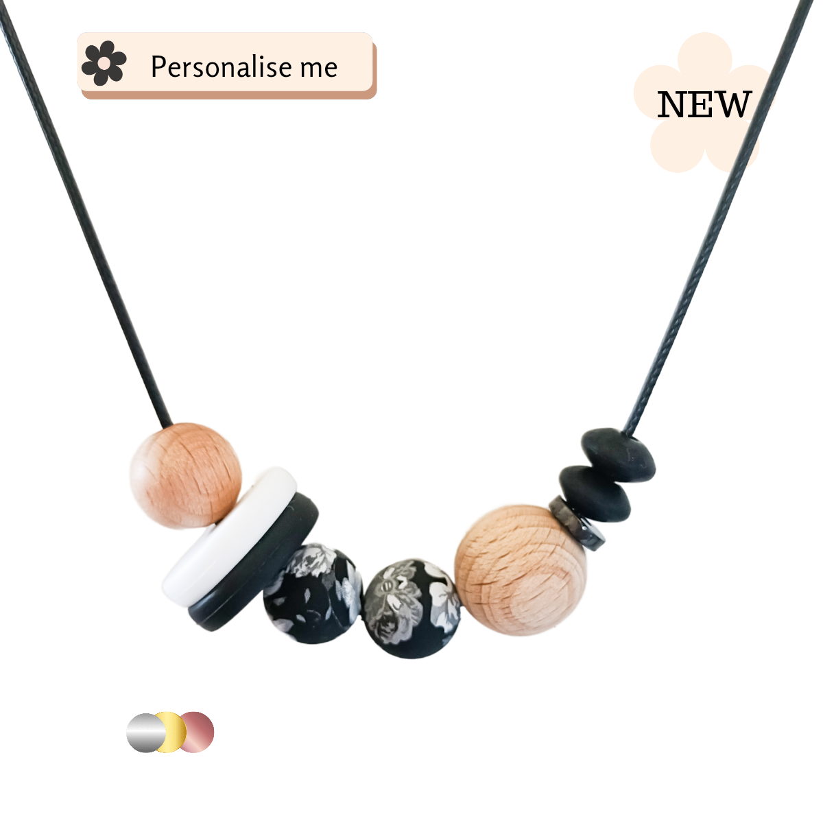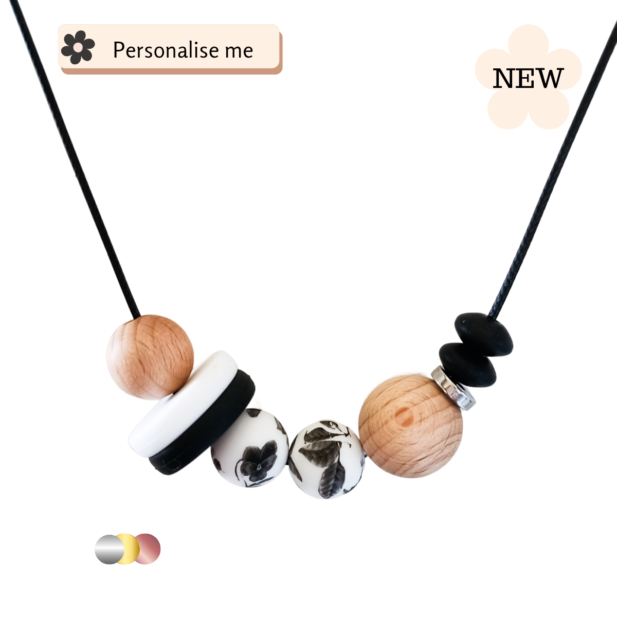 Our Mono Bloom balance necklace provides a statement with its ranging beads of textures colours and patterns. Mixing floral with monochrome,