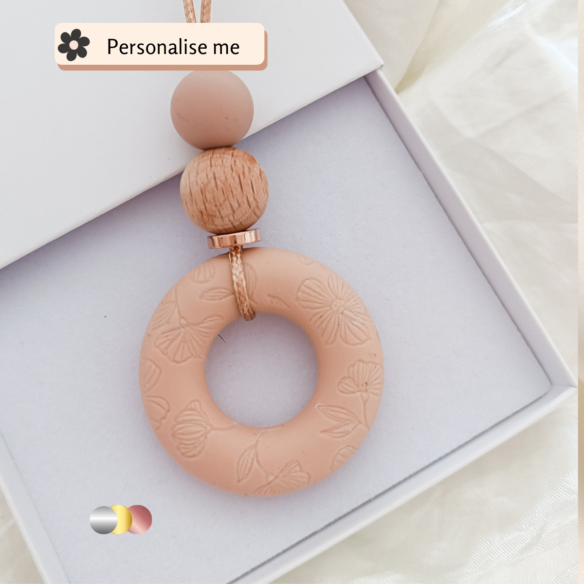 Make a statement of softness and style with this Embossed dusty pink Bloom Pendant! Crafted with a floral flower pattern encased in the silicone,