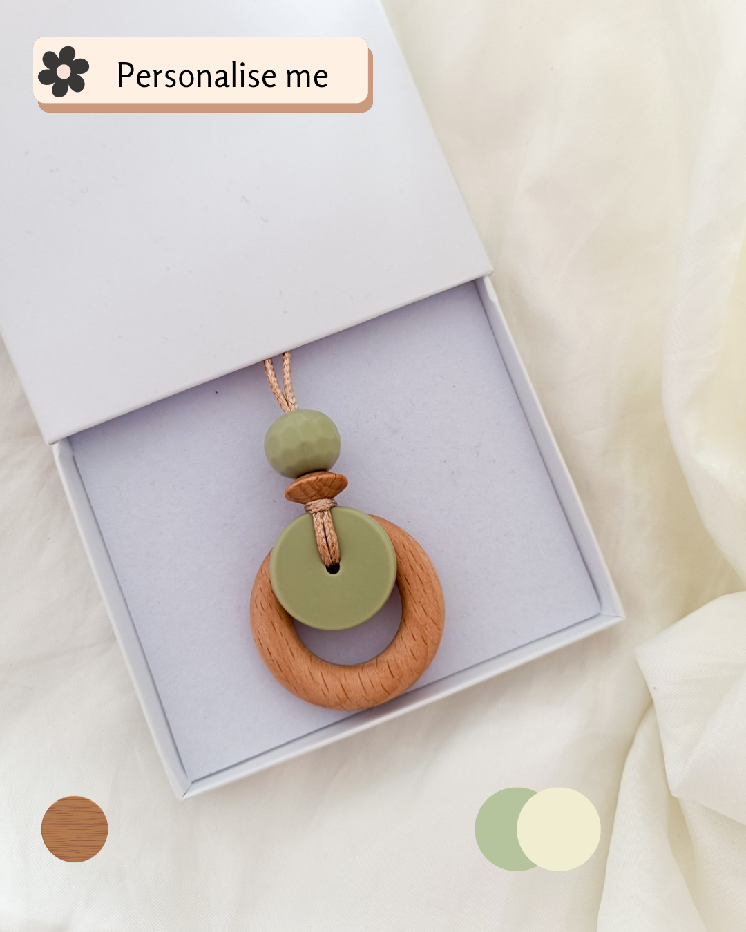This Lint Grain Pendant offers a unique combination of softness and style! A beautiful Faceted pattern is encased in durable silicone, this breastfeeding necklace adds a stylish touch to your wardrobe. For an added touch of customization, you can even add a name or date of birth to the wooden bead.