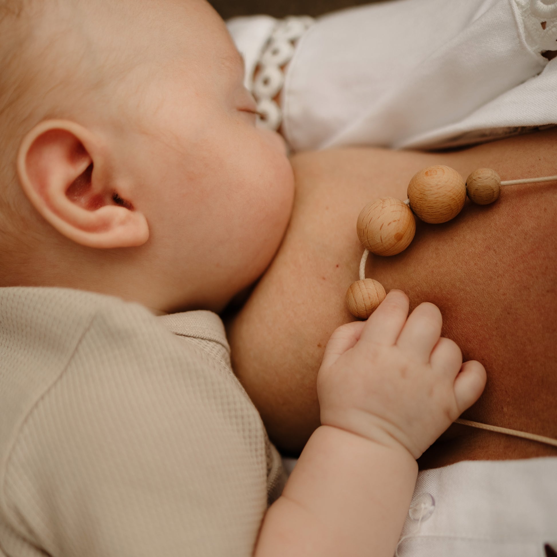 Our Naturals beechwood necklace provides a sensory statement with its ranging beads of textures colours and patterns and rattle effect.