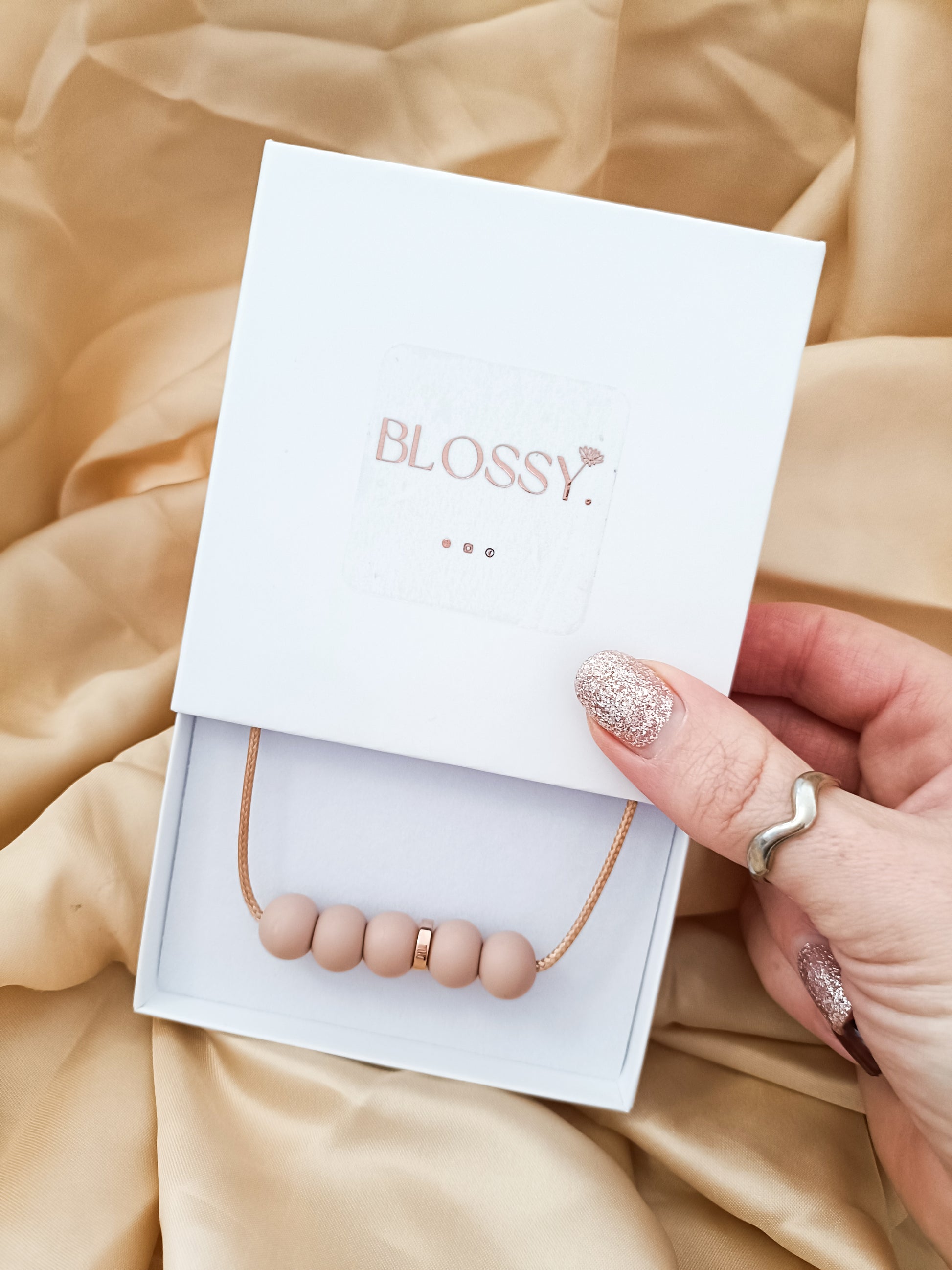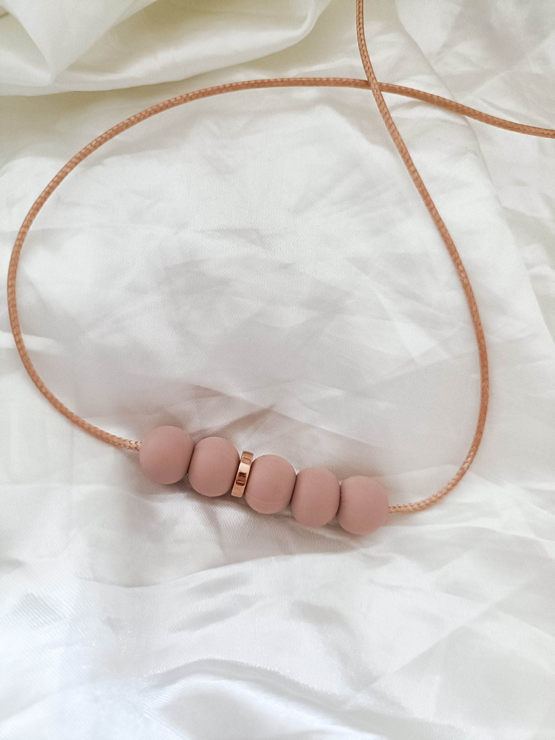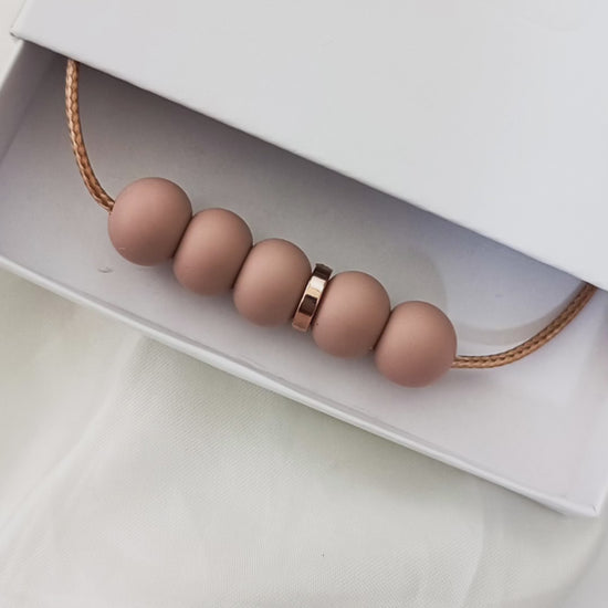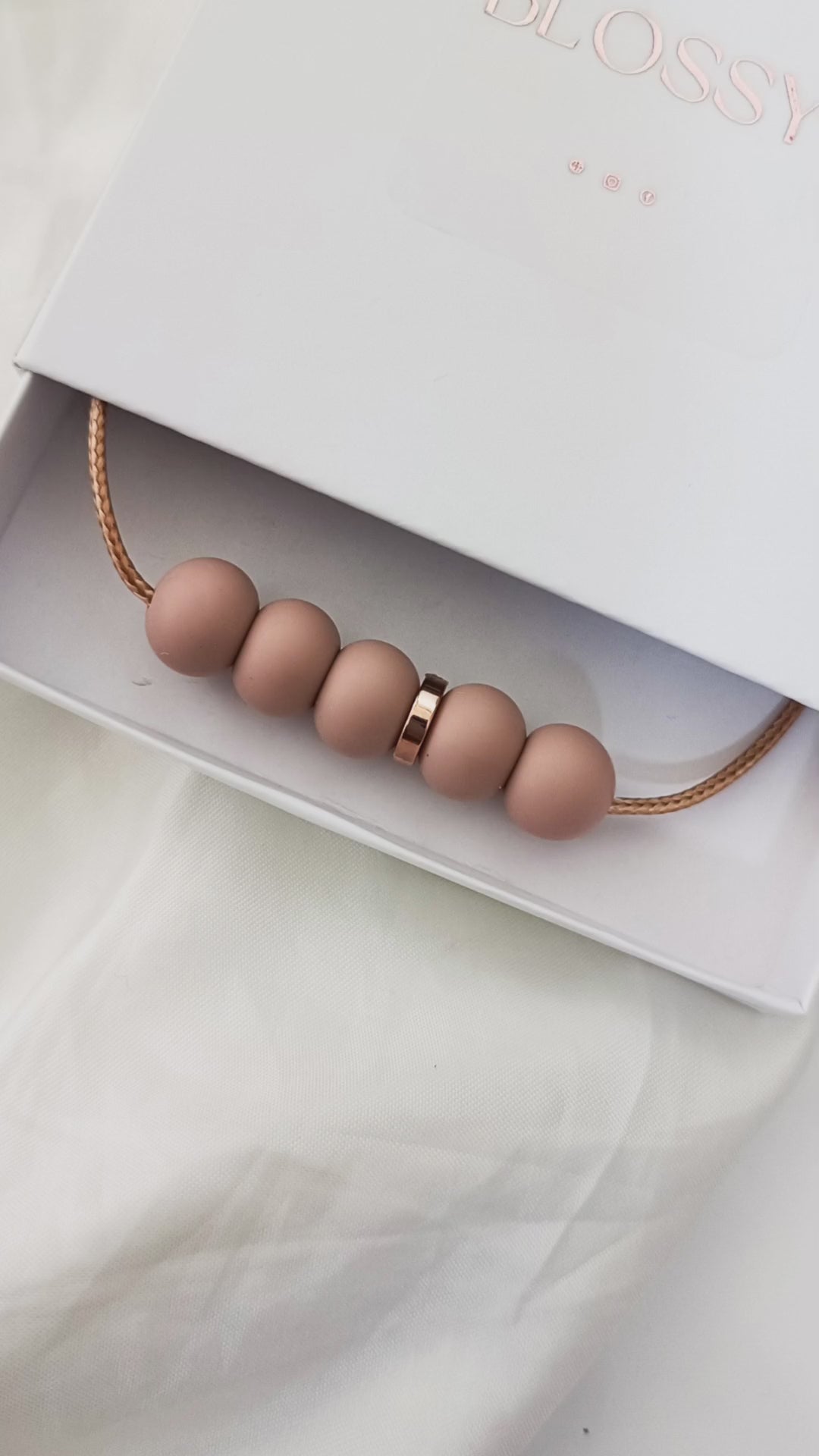 - Five 12mm Round silicone Dusty oatmeal coloured beads divided by a statement stopper.