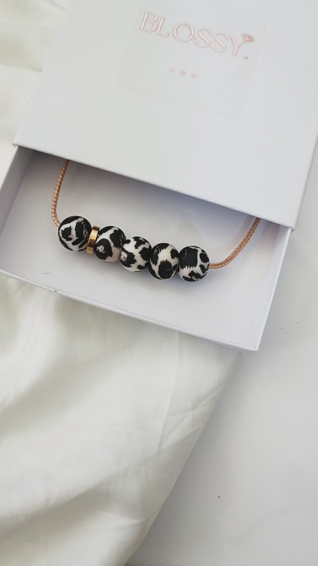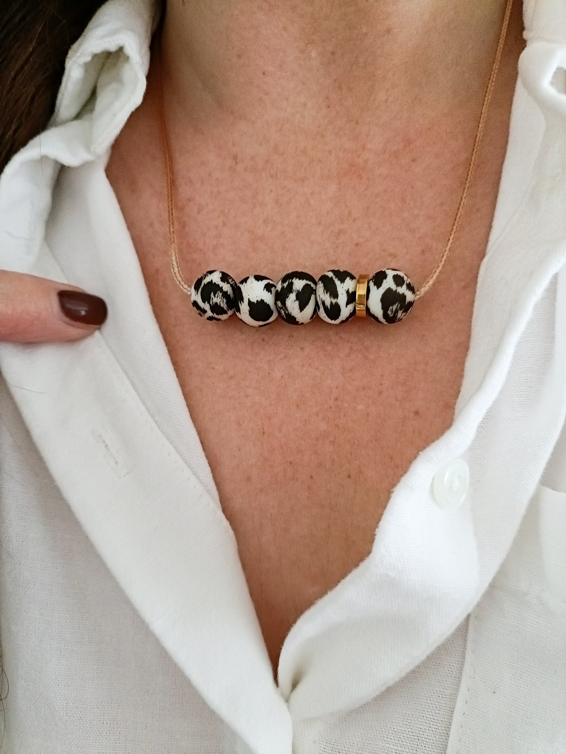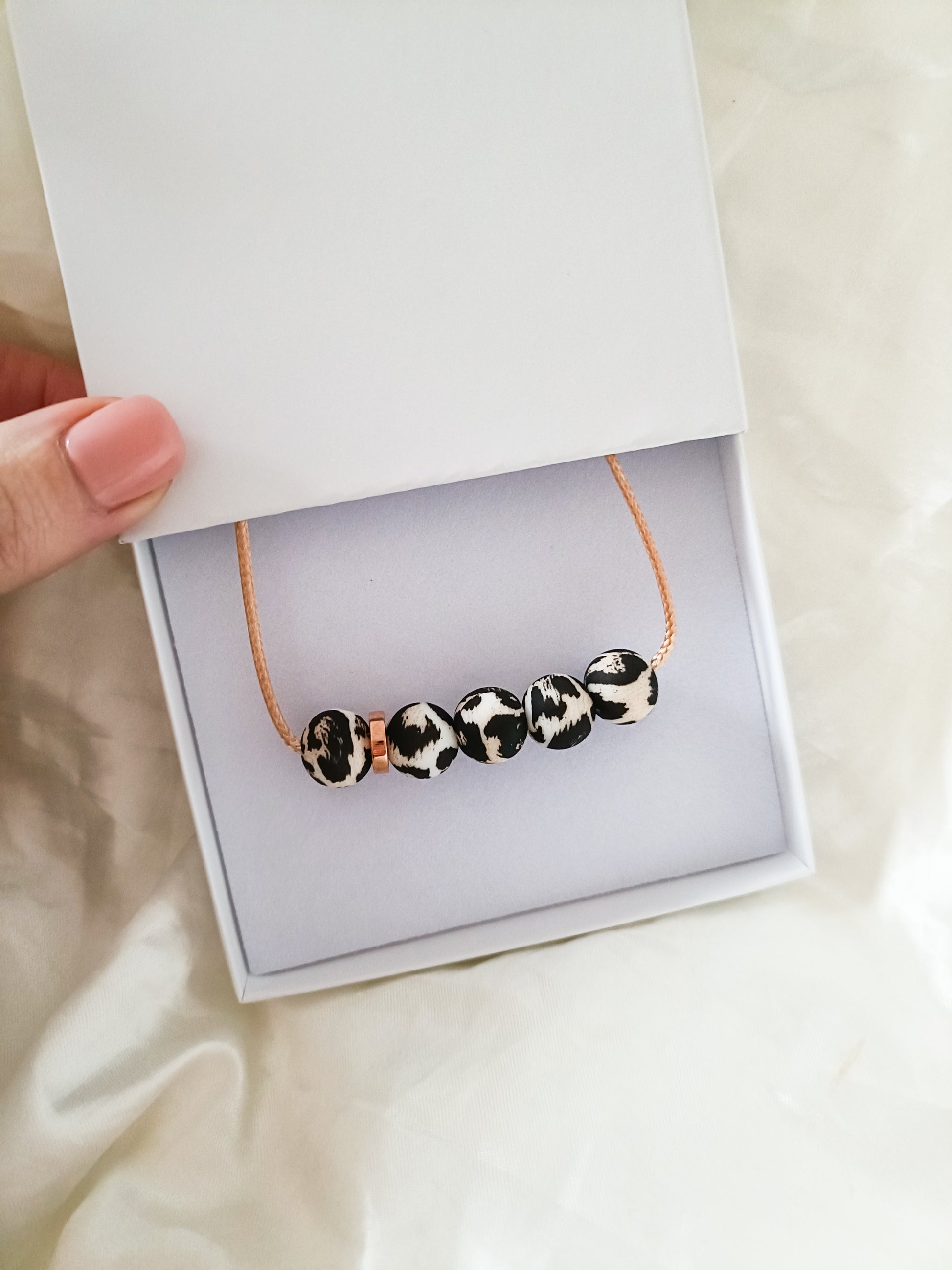 - Five 12mm Round silicone leopard beads divided by a statement stopper.