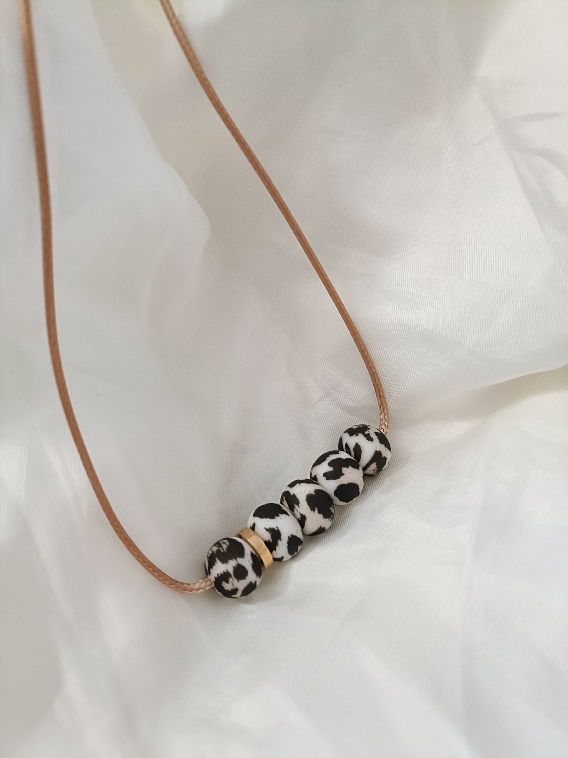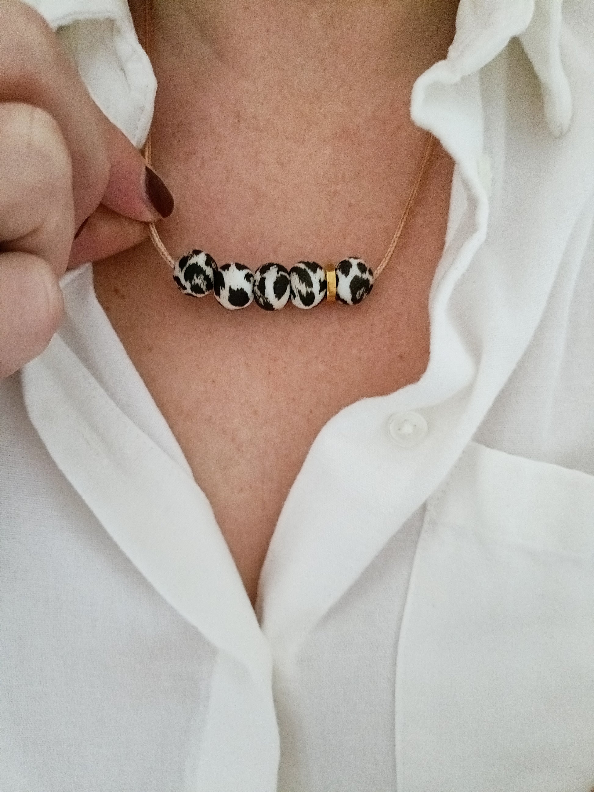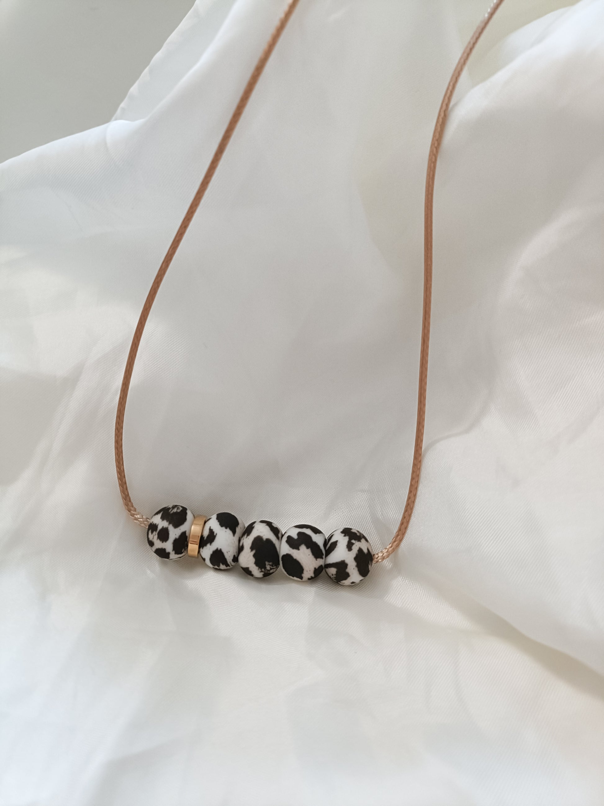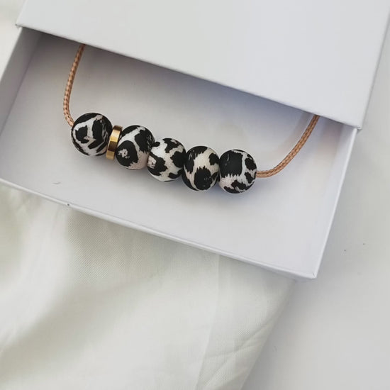- Five 12mm Round silicone leopard beads divided by a statement stopper.