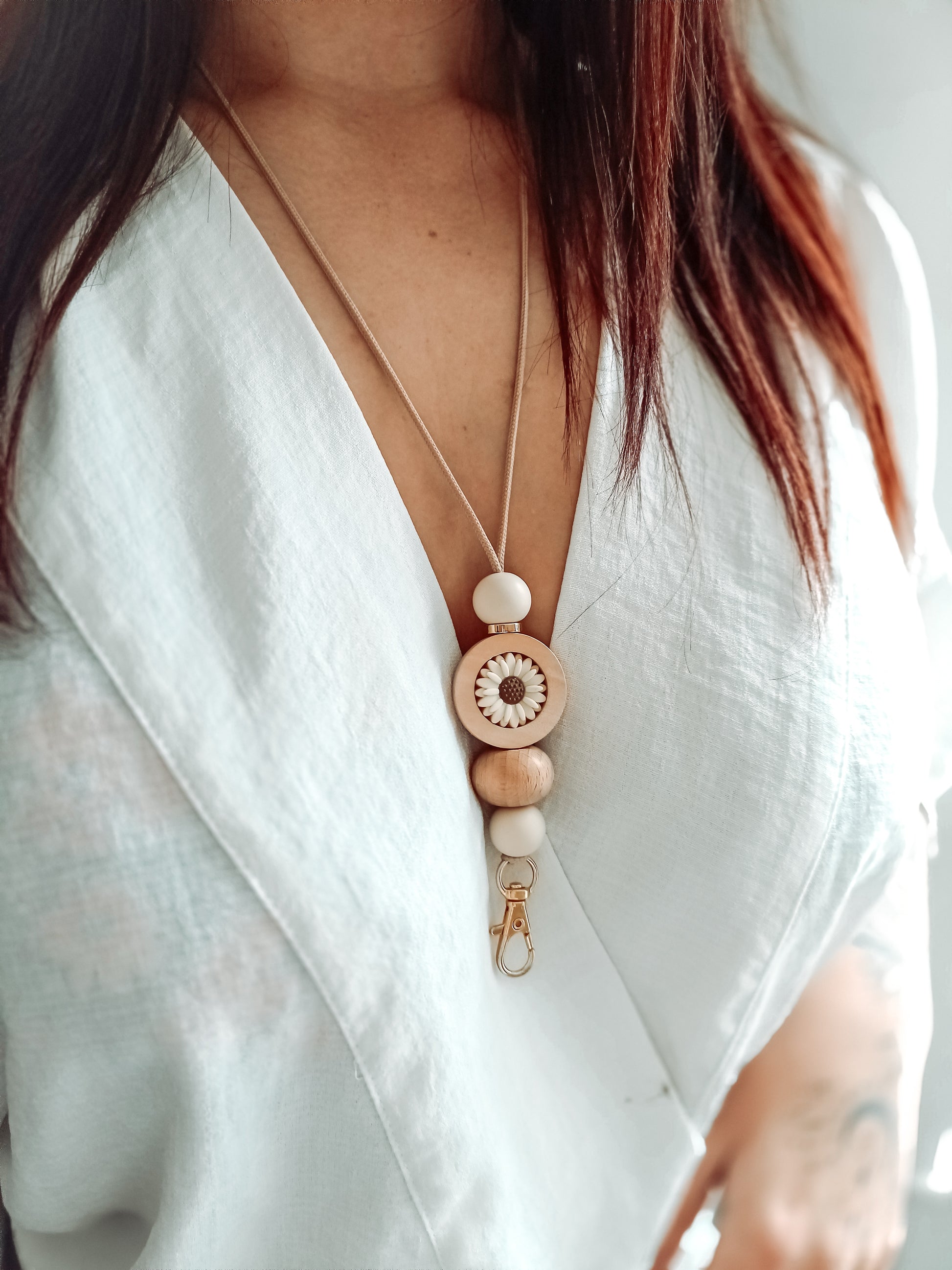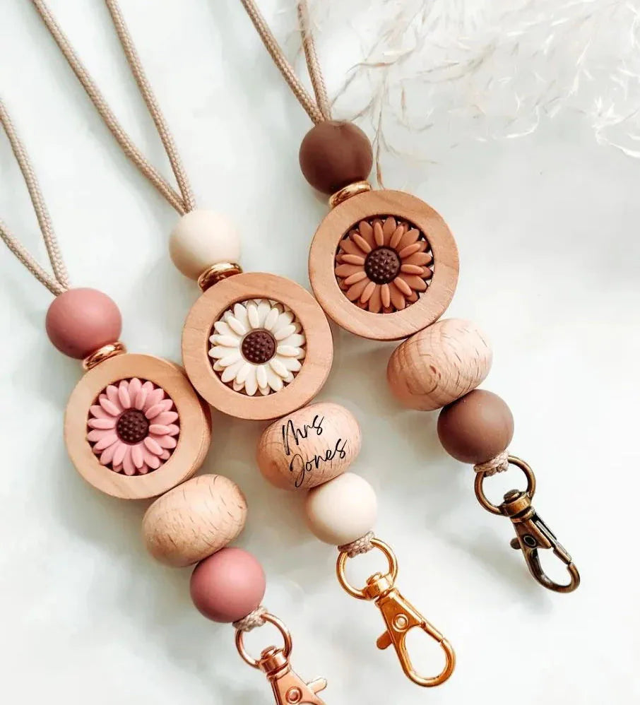 Teacher Floral Lanyard with Wooden Circle daisy.